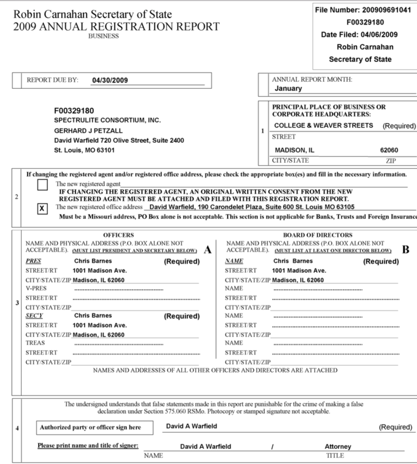A corporate registration report filed earlier this year with the Missouri Secretary of State’s office shows the president of West Lake Quarry as William Whitaker, a retired mining engineer who lives in O’Fallon, Mo. St. Louis attorney Bernard C. Huger is listed as the secretary of the corporation. The same two individuals are now the sole members of the board of directors. Both men say they have represent the church’s interests in the company.