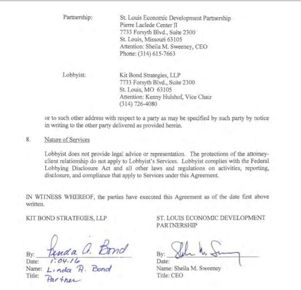 In January 2016, Linda Bond, the former senator’s wife, signed a contract with St. Louis Economic Development Partnership CEO Sheila Sweeney. The Development Partnership is a joint government agency of the city of St. Louis and St. Louis County, which wields broad powers and operates largely in the shadows with the benefit of millions of dollars in annual payments from casino interests raked in by the St. Louis County Port Authority, an agency that shares the same staff as the Development Partnership. The County Port Authority’s purpose has nothing to do with ports. Instead, it acts as a conduit for the casino payments.