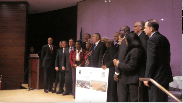 All Smiles: Former St. Louis County Executive Steve Stenger (fourth from left) poses with other dignitaries on Dec. 13, 2018 at the NGA Land Transfer ceremony held at the St. Louis Public Library Central Branch. Immediately behind Stenger is Deputy Assistant Secretary of the Air Force Richard K. Hartley, a former CIA operative attached to the National Reconnaissance Office, 1997 to 2003.