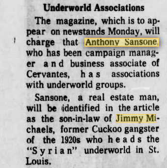 Walsh alleged the mayor had mobbed-up business ties and main-rained a “steady liaison” with organized crime figures through Anthony Sansone, his campaign manager. Sansone, a successful real estate broker, was the son-in-law of Jimmy Michaels, leader of the Syrian faction of St. Louis’ underworld. Michaels, in turn, was a criminal associate of Anthony “Tony G” Giordano, don of the St. Louis mafia.